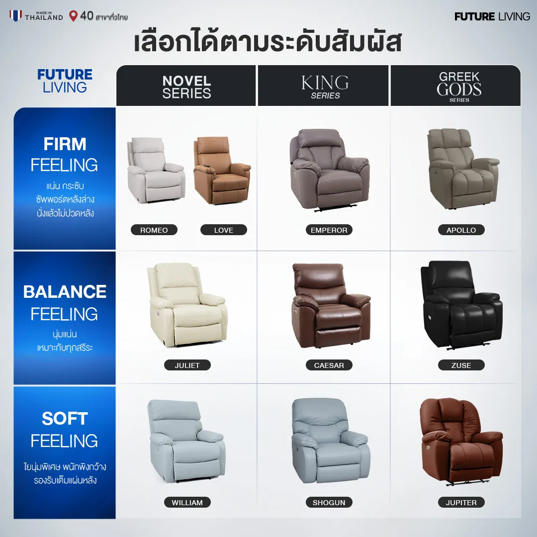 การแบ่งโซฟาเป็น 3 ระดับ Balance / Firm / Soft ที่ปรับความแน่นตามรุ่นจากฟองน้ำ ใย และ สปริง