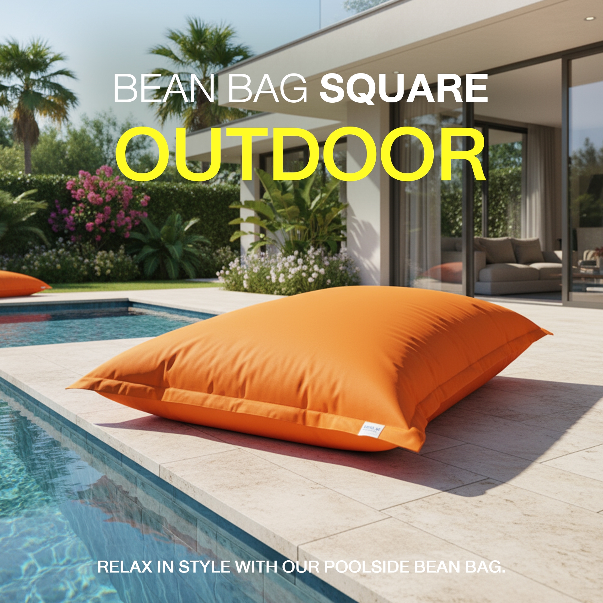 Ultra-photorealistic image of a large rectangular outdoor bean bag in bright orange color placed beside a luxury villa swimming pool. The bean bag rests naturally on the stone poolside deck, showing its smooth outdoor fabric texture, durable and weather-resistant. The crystal-clear pool water reflects the sunlight, creating a relaxing vacation atmosphere. Tropical greenery surrounds the villa with a modern architectural touch, evoking a premium resort vibe. Bright daylight, cinematic detail, 8K resolution, sharp focus, realistic proportions, no distortion.